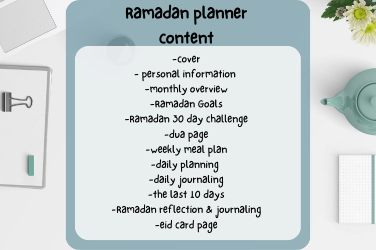 Our first product is a digital & printable Ramadan planner that will help you make the most of this blessed month. and designed to help you maximize the benefits of the holy month of Ramadan by helping you stay organized and on track throughout the month of Ramadan.